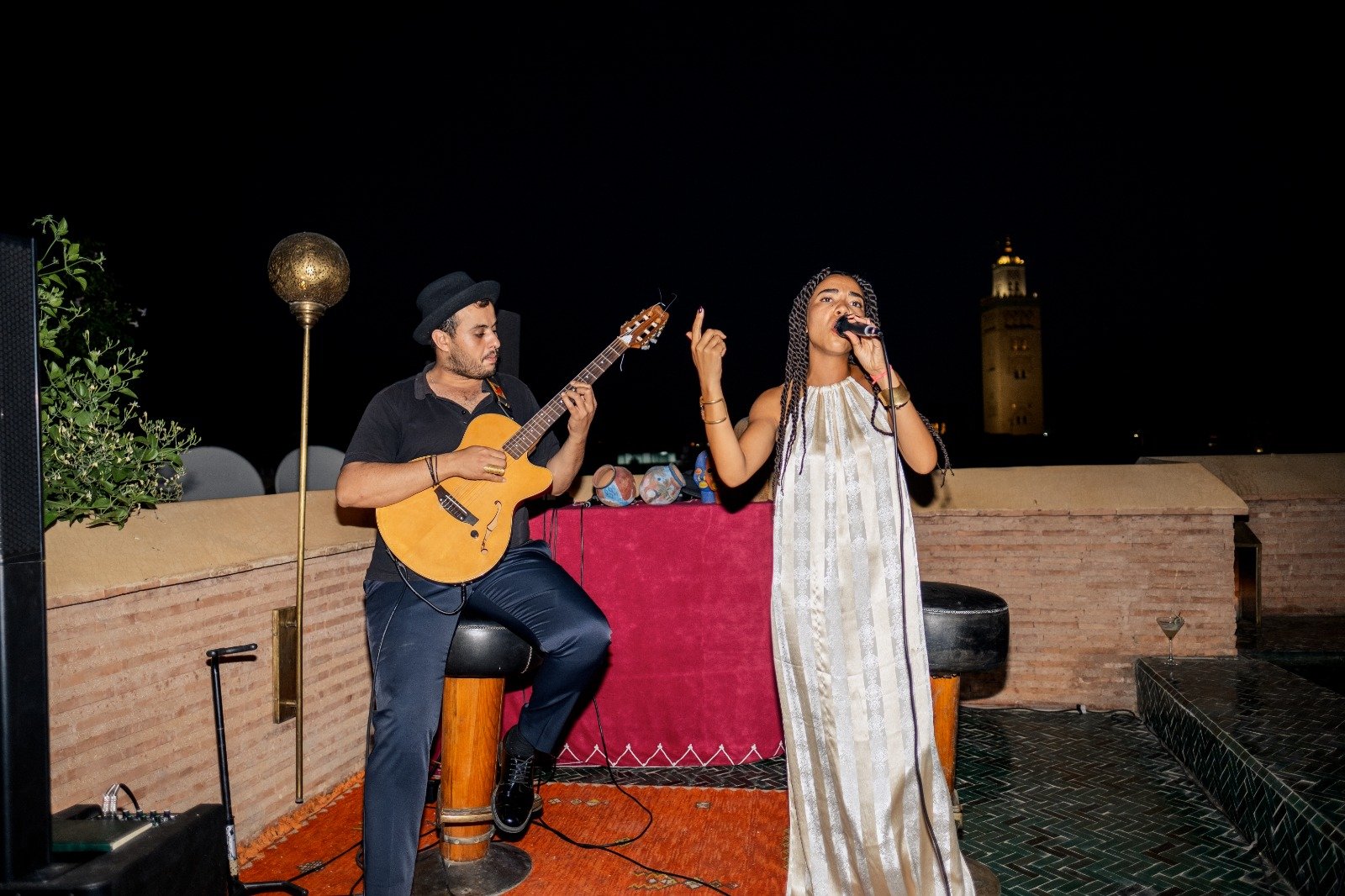 An evening acoustic concert on the rooftop of El-Fenn Hotel with musicians Soul Sphinx,Cheba HASNA and Hakim Kerry. Curated in collaboration with Le 18, Marrakesh.